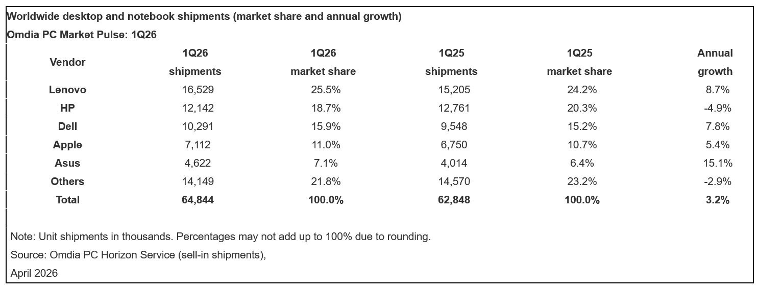 Omdia:Q1 全球 PC 出貨量同比增長 3.2%,內(nèi)存 SSD 漲價(jià)擠壓全年利潤