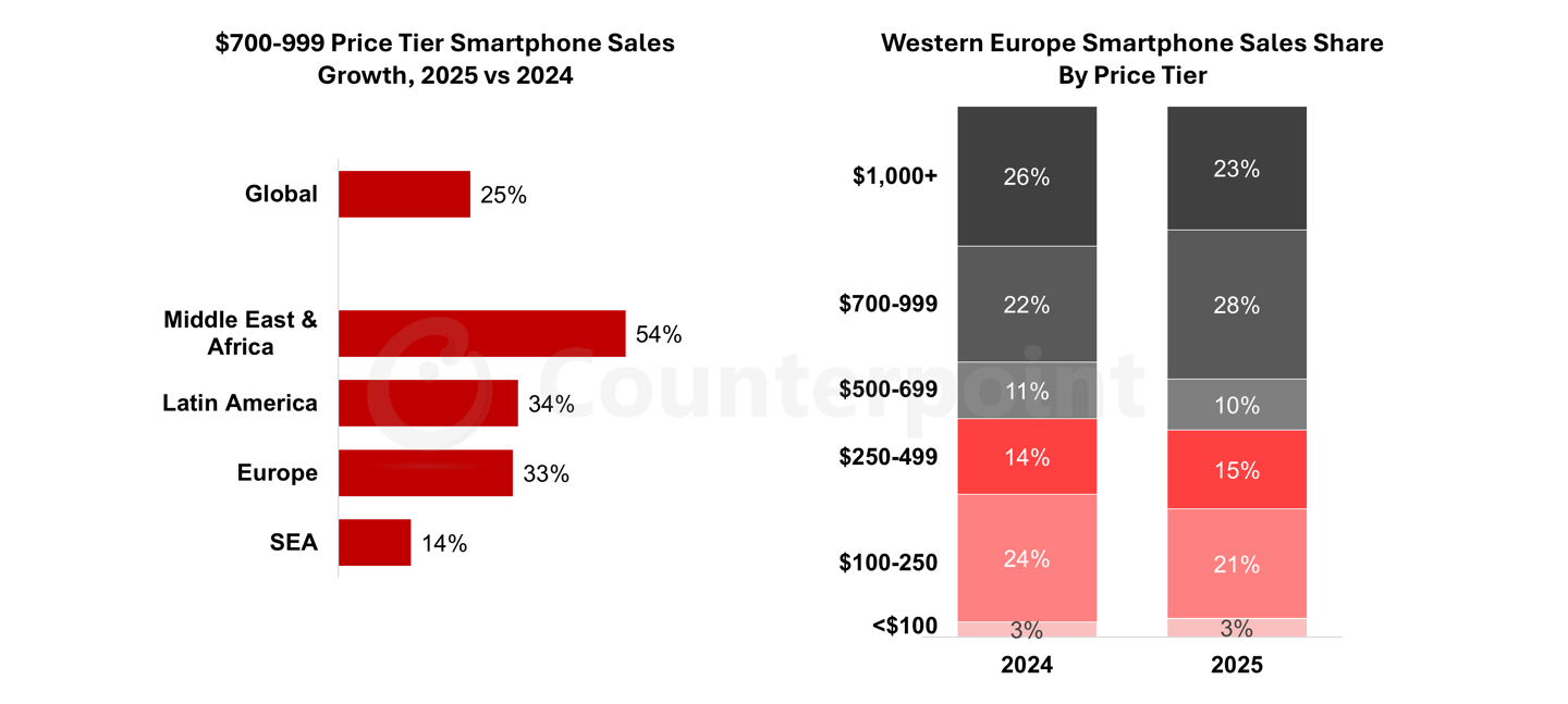 “平價旗艦”在 2025 年已是全球智能手機(jī)增長最快的細(xì)分市場,銷量較 2024 年提升了 25%,在西歐成為了當(dāng)?shù)刈钍軞g迎的品類。高端功能與相對較低的購入成本使此類產(chǎn)品成為當(dāng)下的均衡之選。