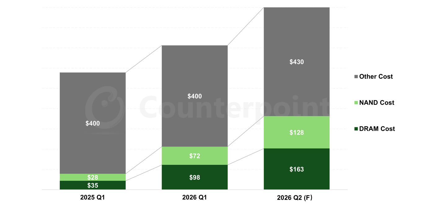 最終,高端智能手機(jī)在 2026Q2 末的物料成本將較 2025Q1 增加超過 150 美元,這可能導(dǎo)致最終零售價上漲超過 200 美元(現(xiàn)匯率約合 1377 元人民幣)。